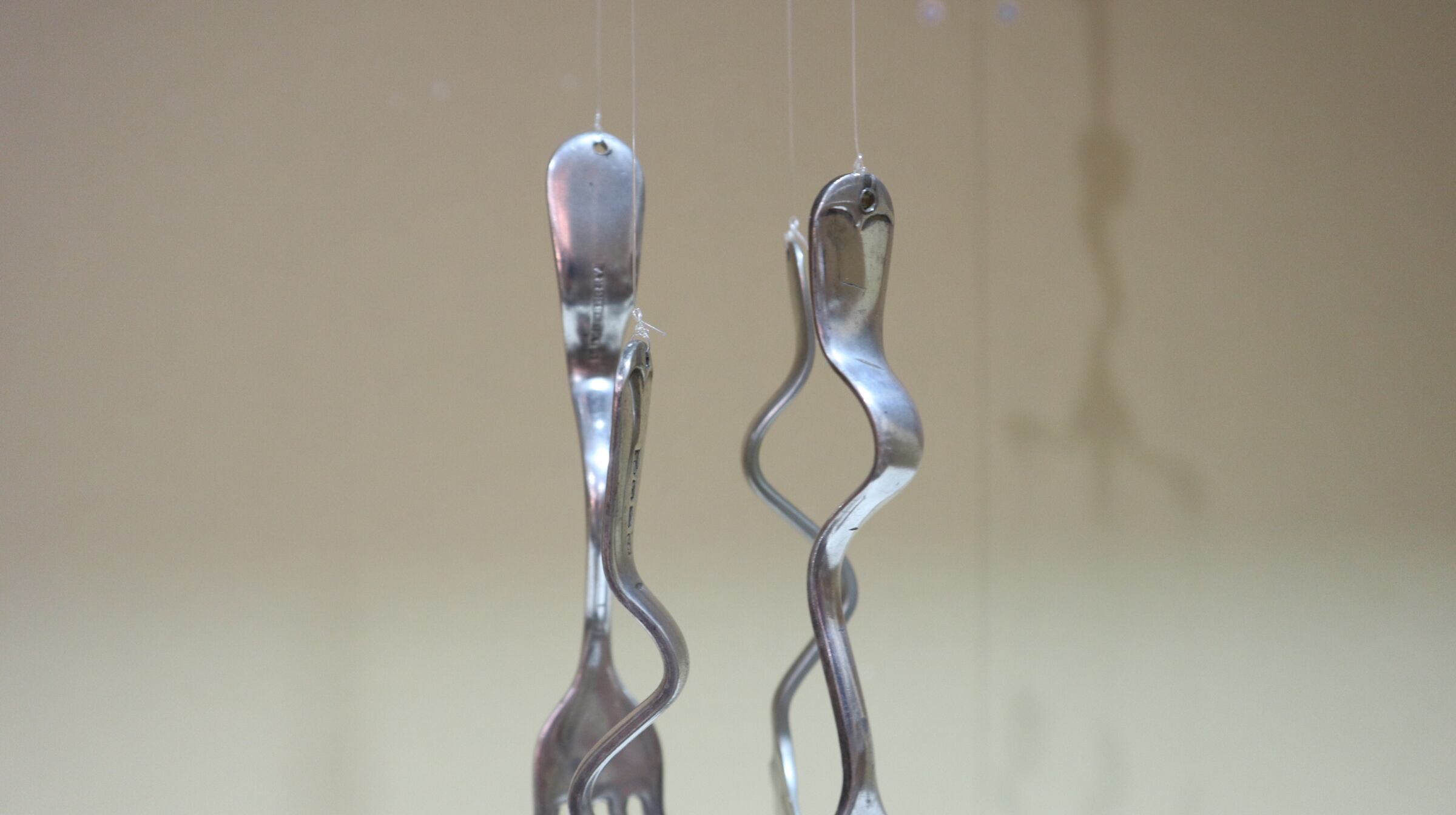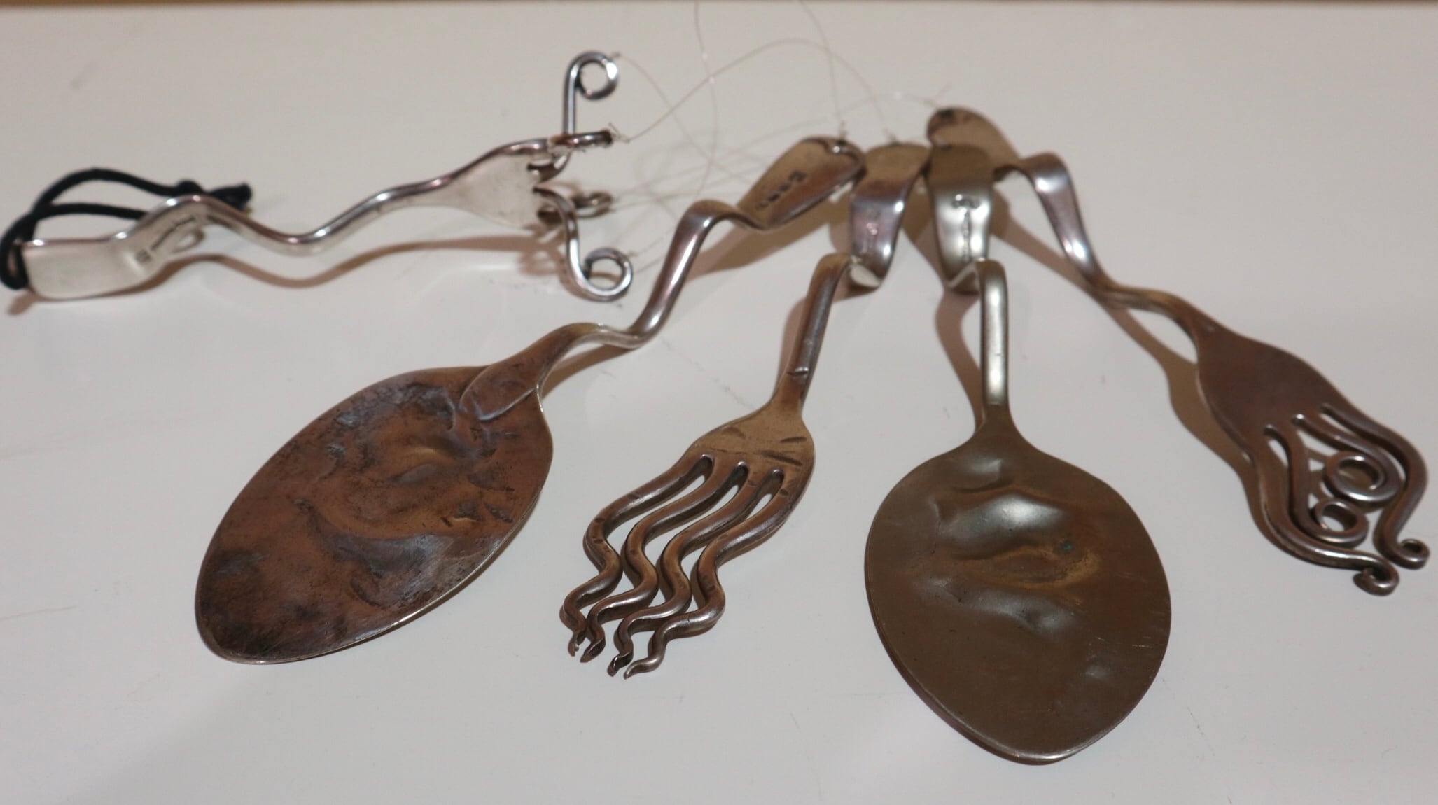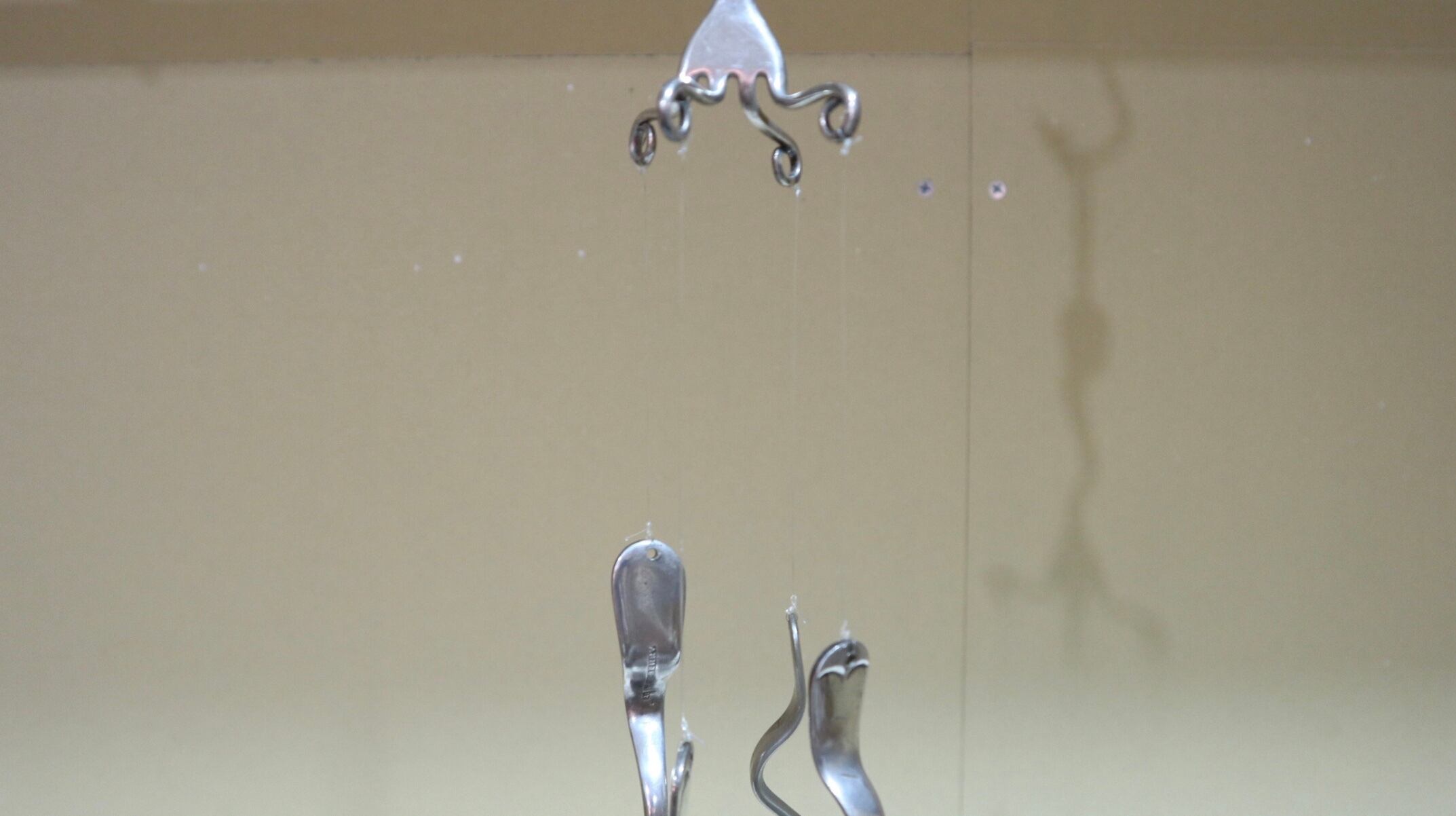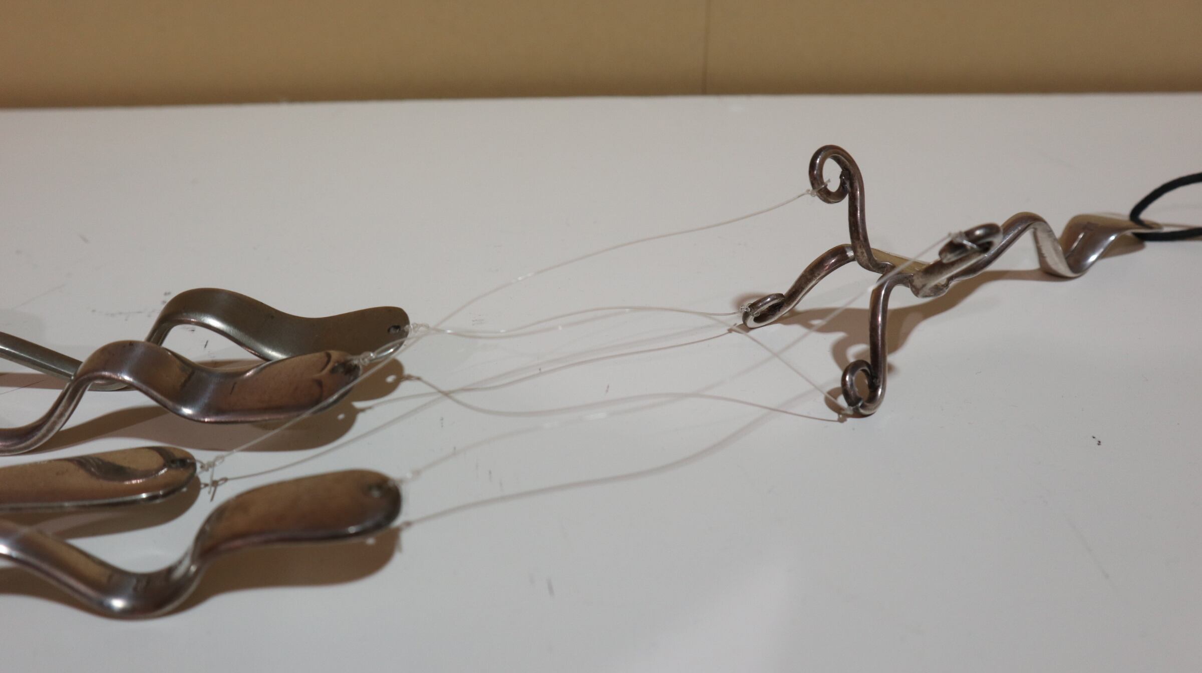1本のフォークから、水糸で4本のスプーンとフォークが吊るされています。