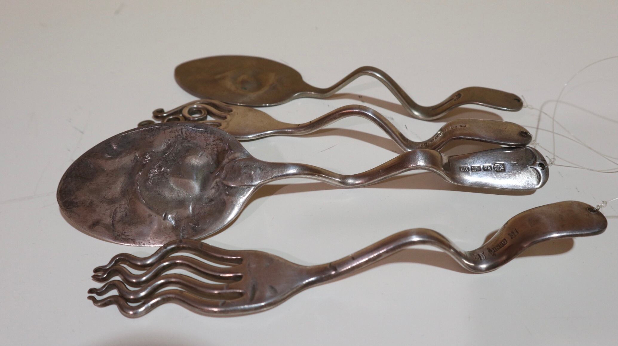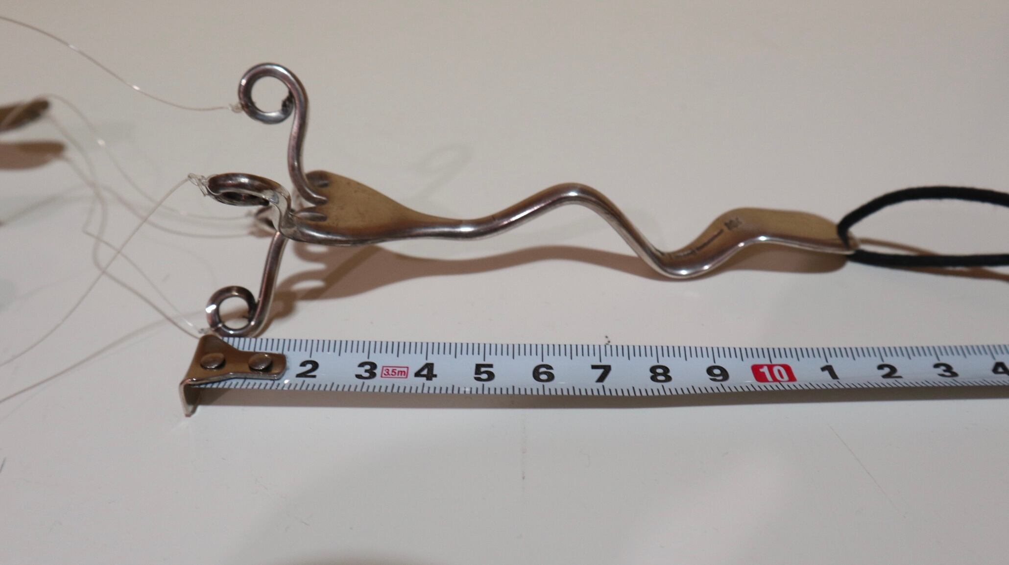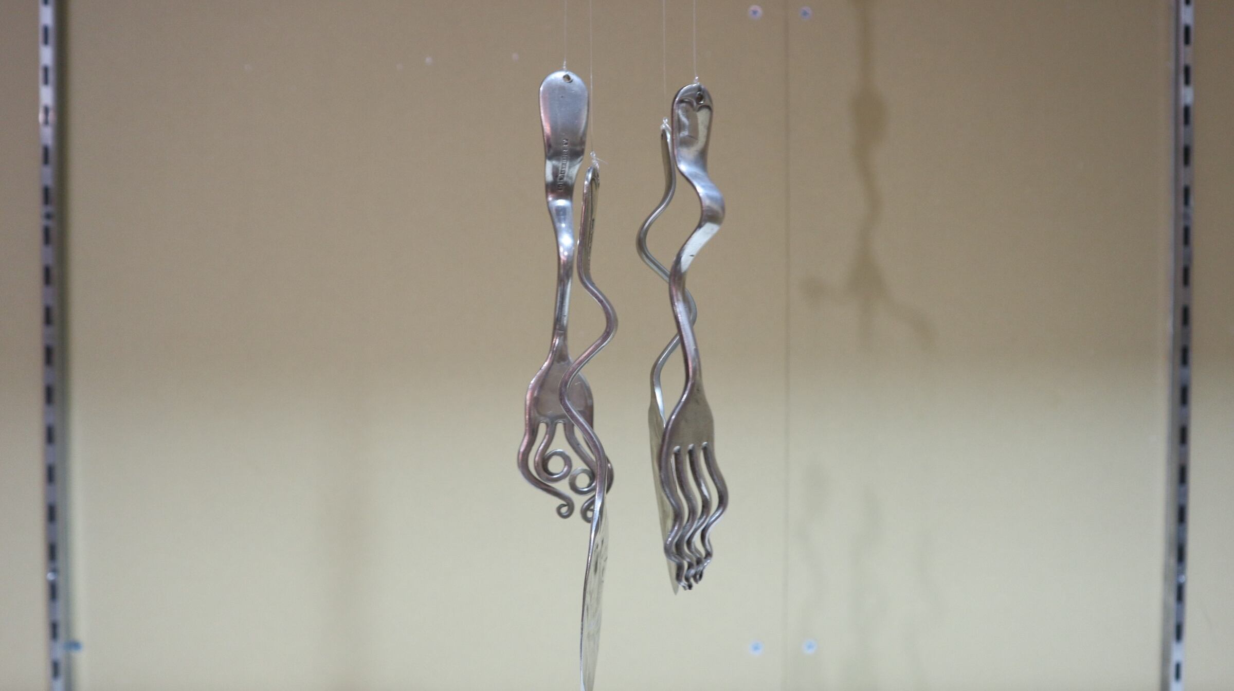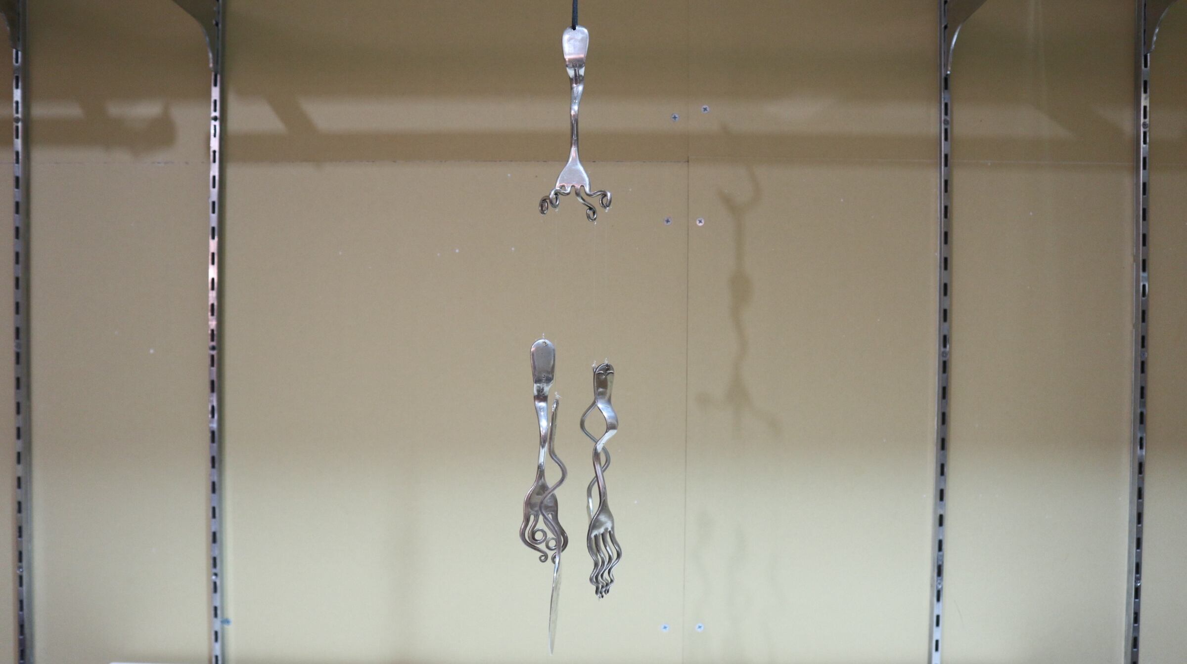 1本のフォークから、水糸で4本のスプーンとフォークが吊るされています。