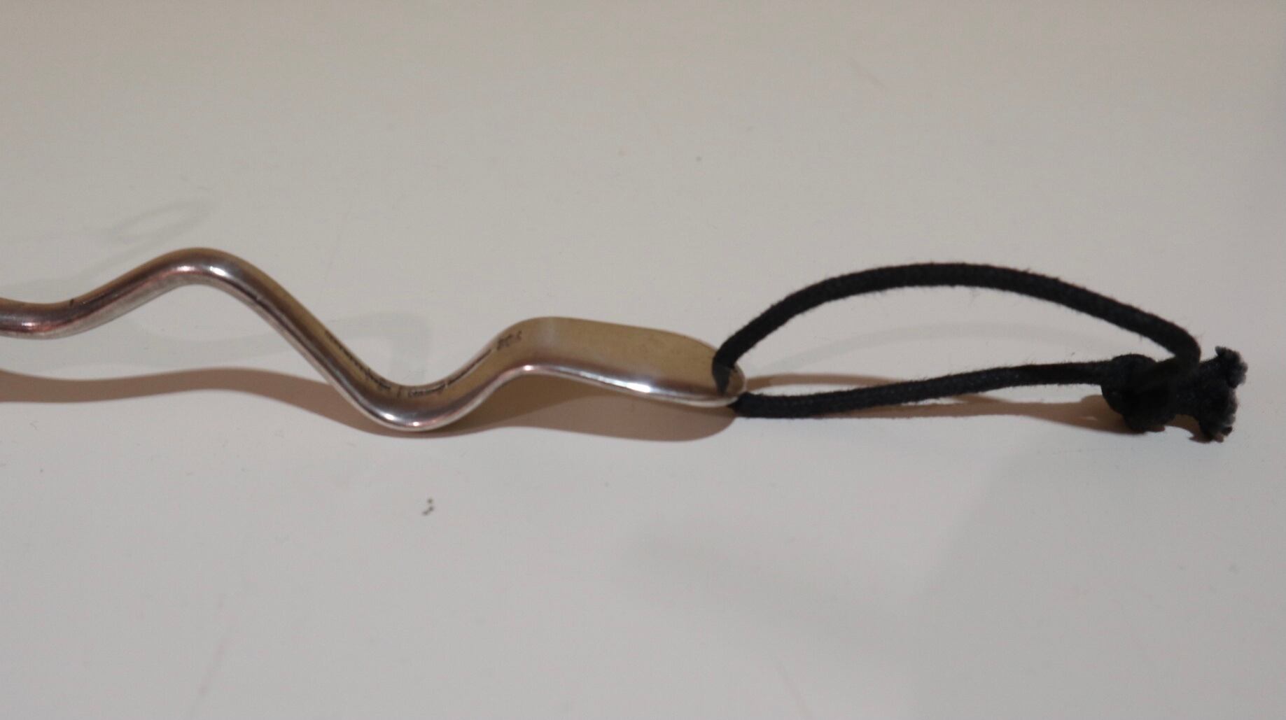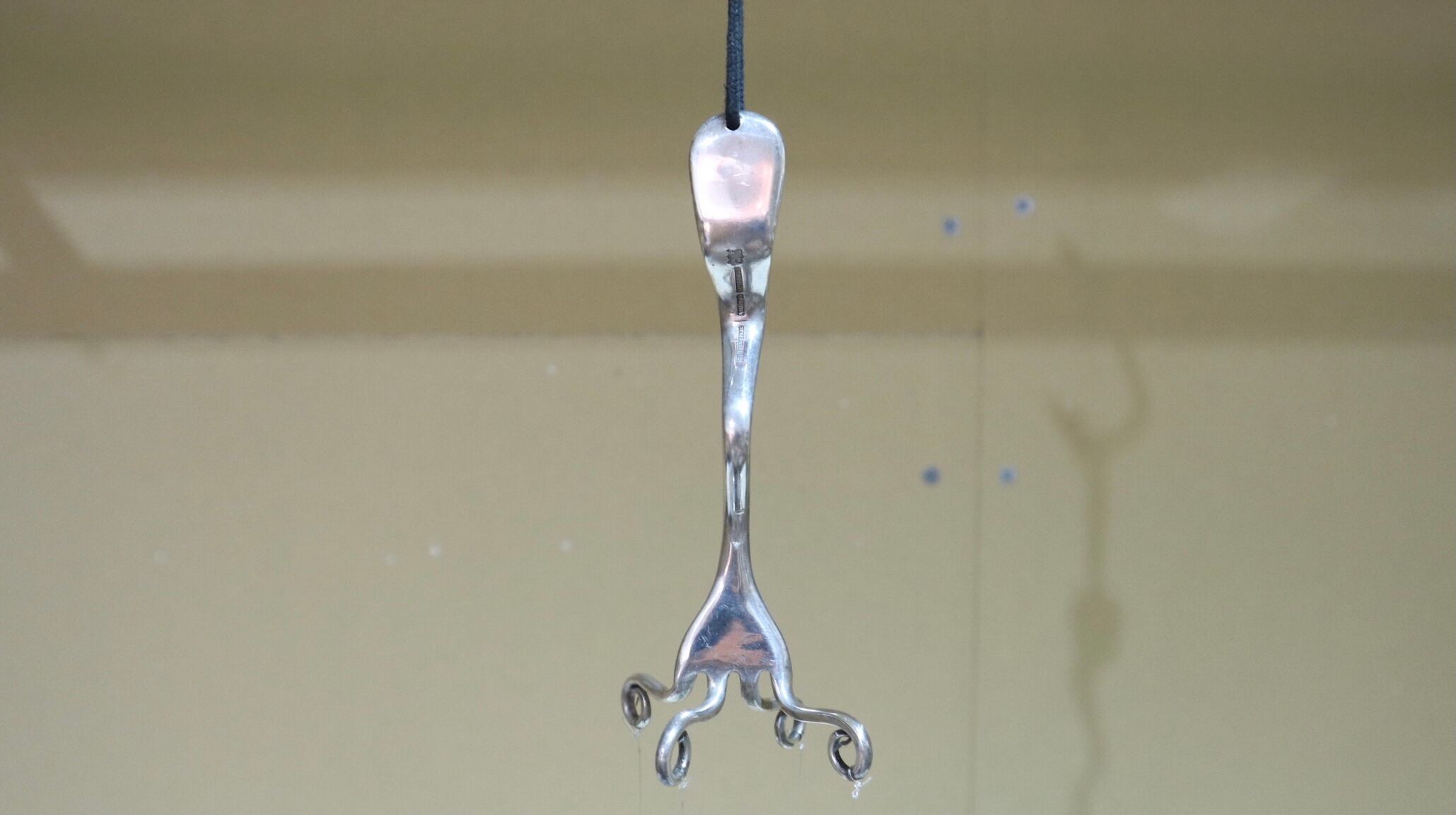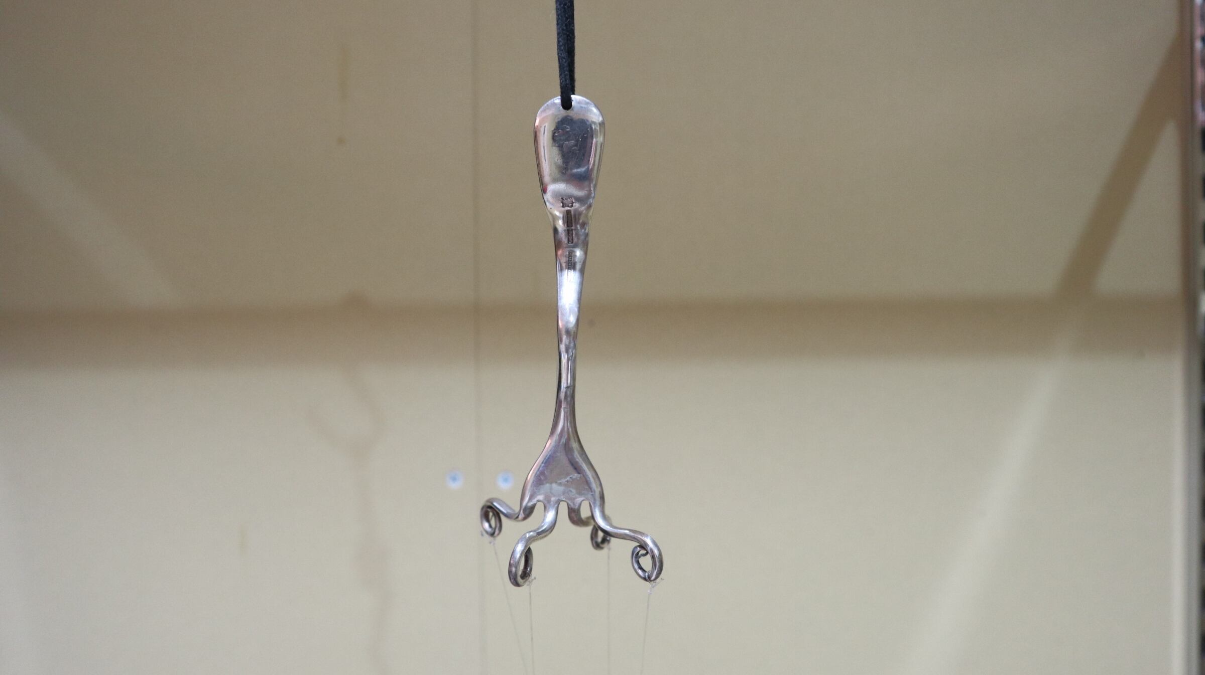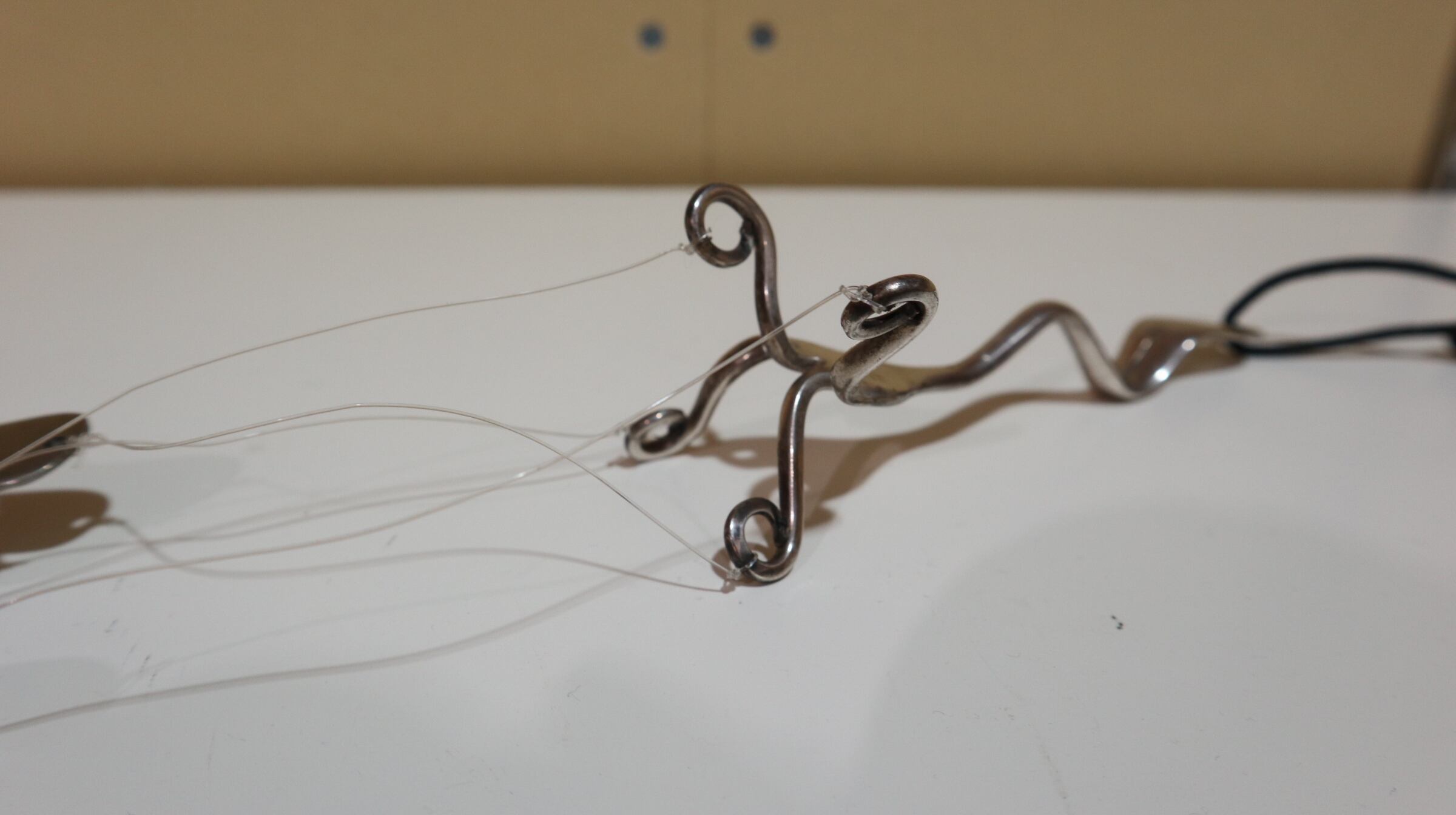 1本のフォークから、水糸で4本のスプーンとフォークが吊るされています。